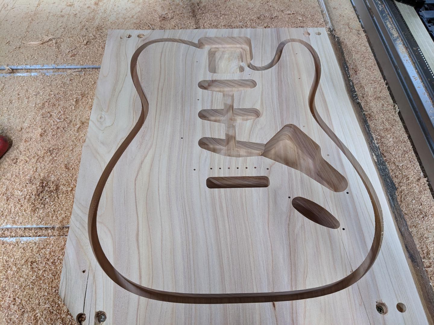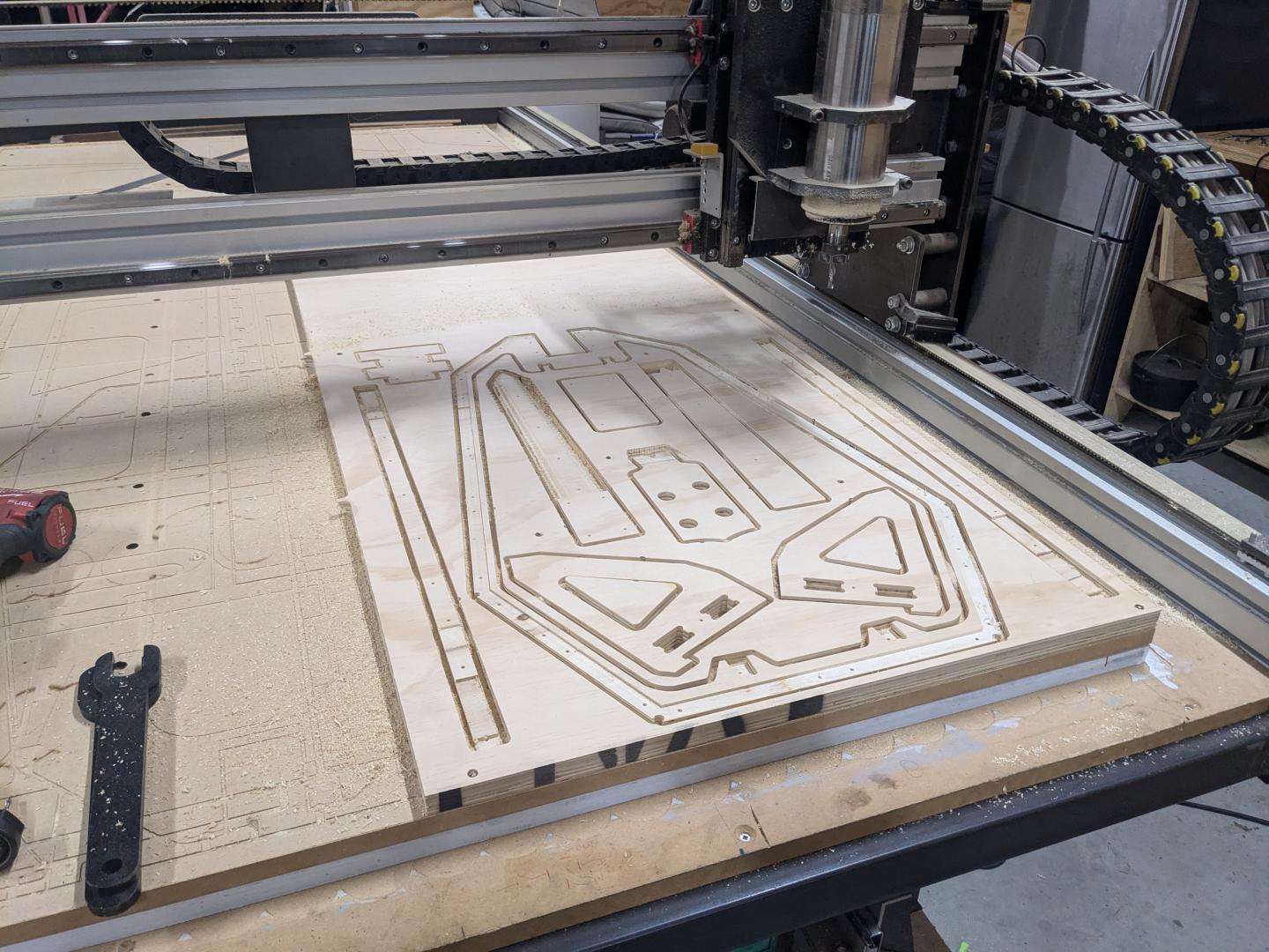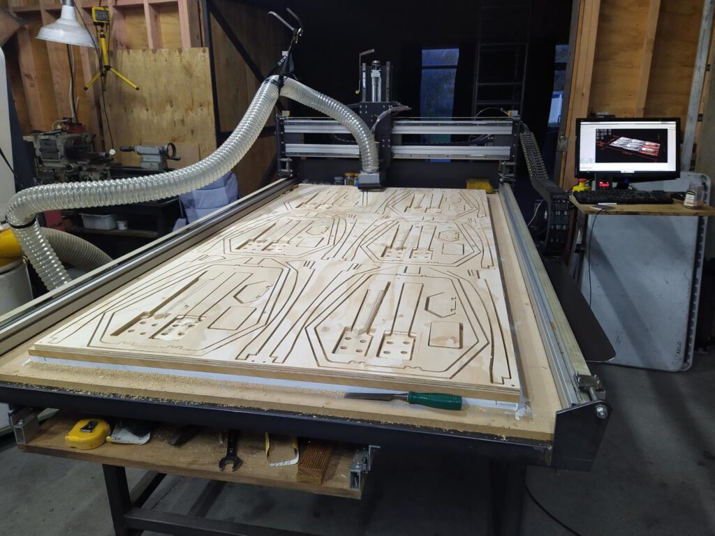 I built my CNC router from scratch as I wanted to cut full size sheets but still be ably to move the unit around the workshop when not in use. It’s control system is LinuxCNC, the setup of which stretched both my electrical and coding knowledge. Even though it is fairly light and mobile it has great accuracy. I use it both for my own projects and production parts for a number of companies. I have made a wide variety of parts, from guitar bodies right through to flat pack, easy assemble furniture. Once a product is drawn in CAD and programmed in it can be replicated exactly as many times as needed.